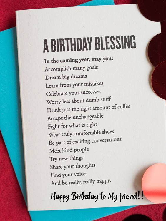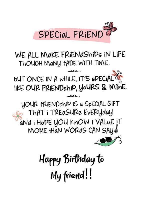 Side by side or miles apart True friends are always close to your heart Whether you’re turning five or fifty-three You know that I’m a true friend because you’re here beside me I’m here, right now, on your special day So lets give a cheer for you, hip, hip, hooray!